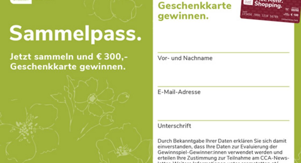 Sammelzeitraum: Von 2.–31.03.2026. Bitte Sammelpass leserlich ausfüllen. Die Auslosung erfolgt am 2.4.2026 und anschließend werden die Gewinner:innen per Mail verständigt. Ausgenommen: Kauf von Gutscheinkarten und Teilnahme der CCA-Center-Mitarbeiter:innen.